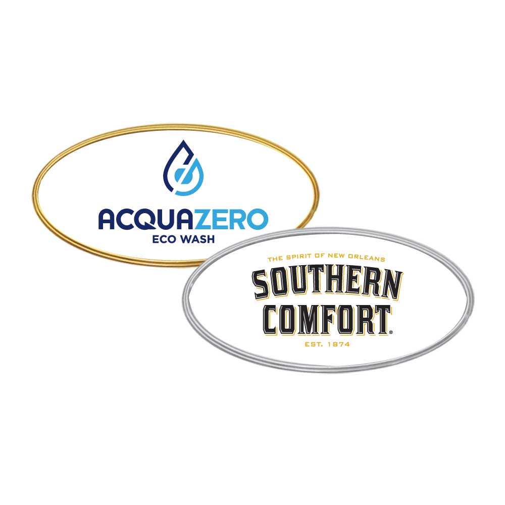 PVC Injected Oval Logo Badges made from durable PVC material, available in 75 x 35 mm and 242 x 60 x 50 mm sizes. Ideal for corporate branding, events, and promotions with high-quality digital printing and epoxy coating.